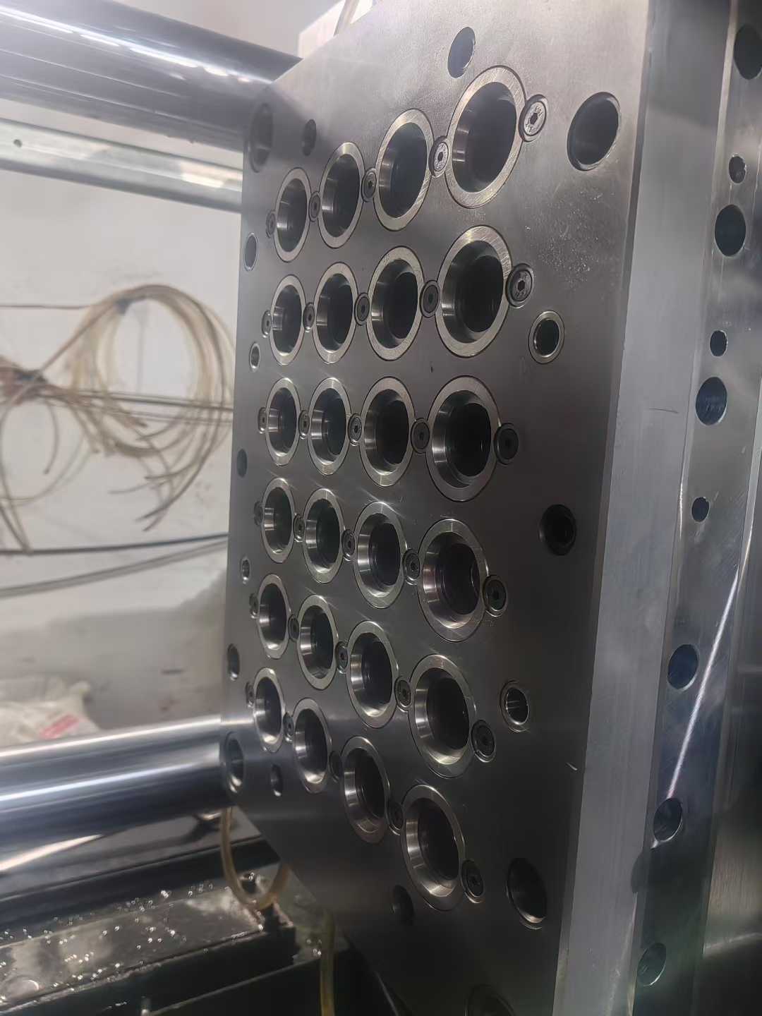 Caption: Our bottle cap mold securely installed in a high-precision injection molding machine, ready for trial.